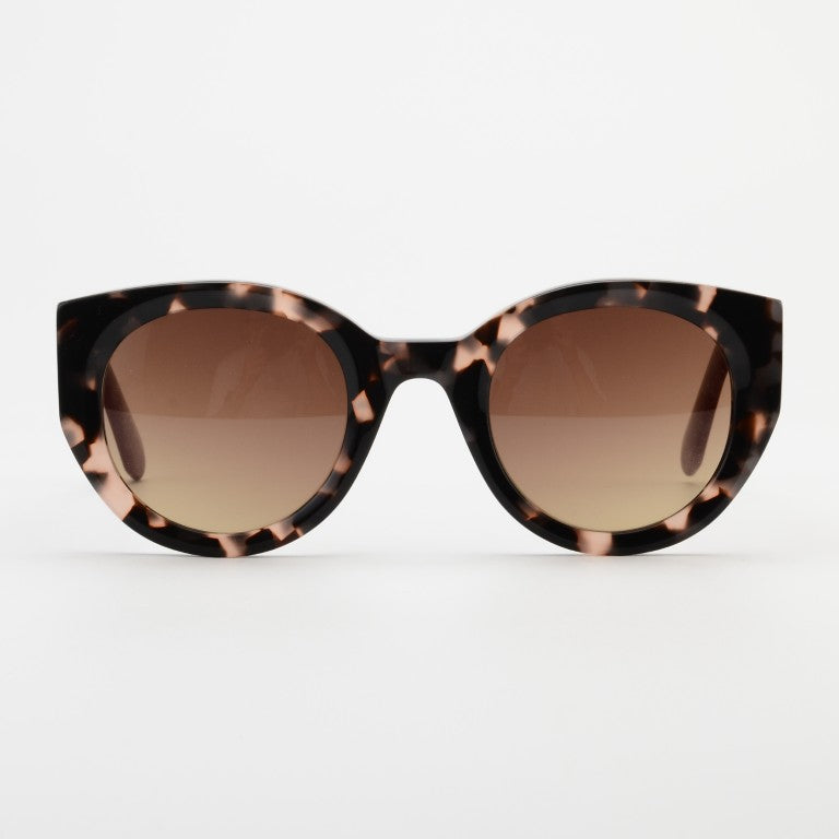 Elegant gemêleerd turtle-rozé grijs front met diepe bordeauxrode temples. De lenzen vervagen van intens cacaobruin naar een lichte, gouden ondertoon voor een verfijnd accent.